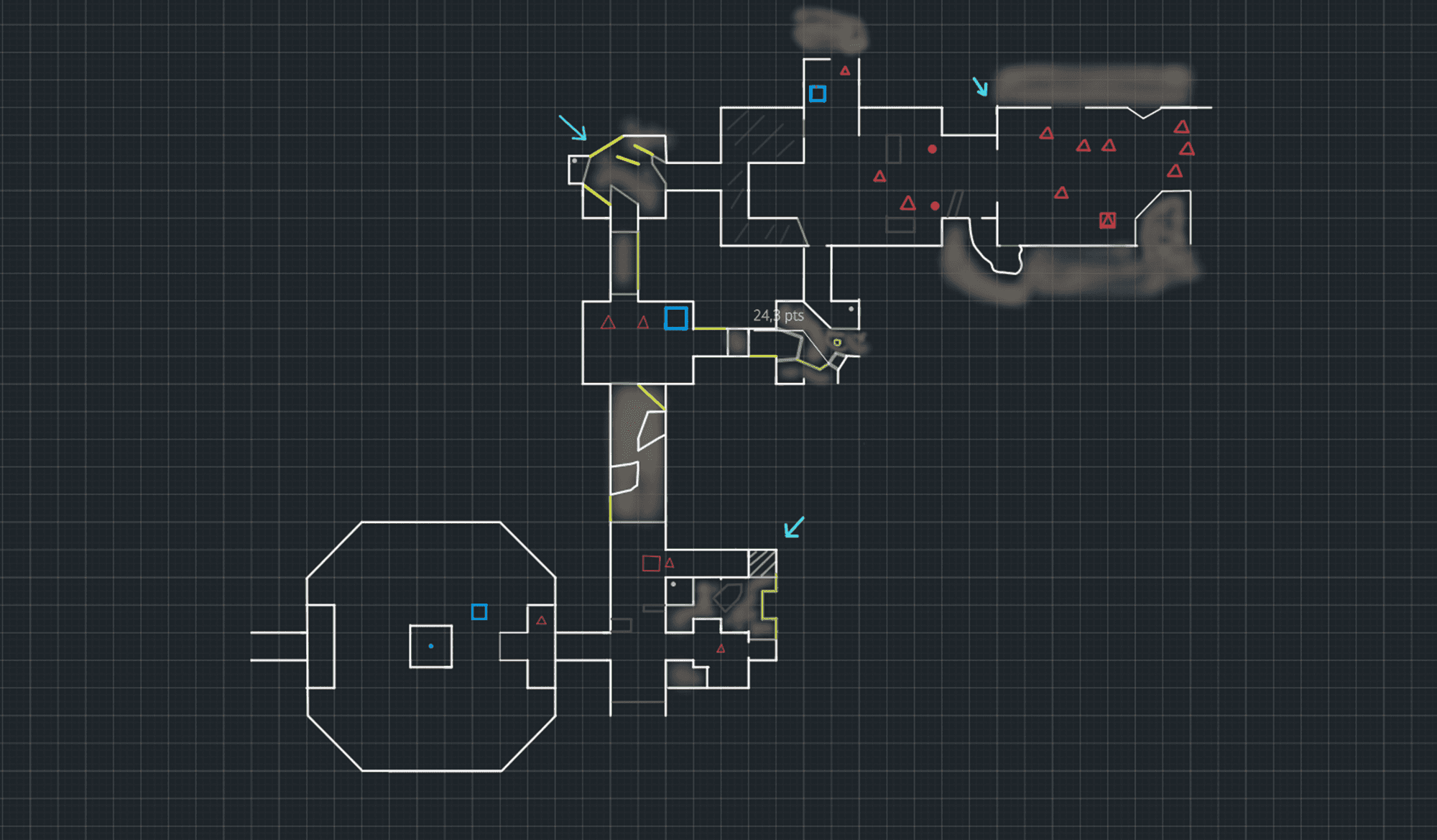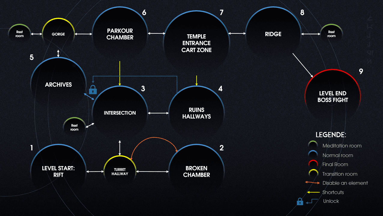 Multiple iterations arose from this endeavor due to the stage's brevity relative to a typical game level. Moreover, the rooms had a hallway-like ambiance, necessitating their redesign.